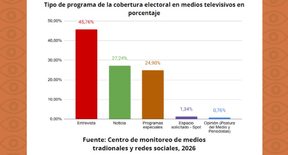 Según el informe, se detectaron 282 notas informativas sobre el proceso electoral con un total de 68.074 segundos de cobertura, equivalentes a 18,91 horas. «En este periodo se identificó la presencia de 29 organizaciones políticas en 6 medios de comunicación monitoreados», se lee
