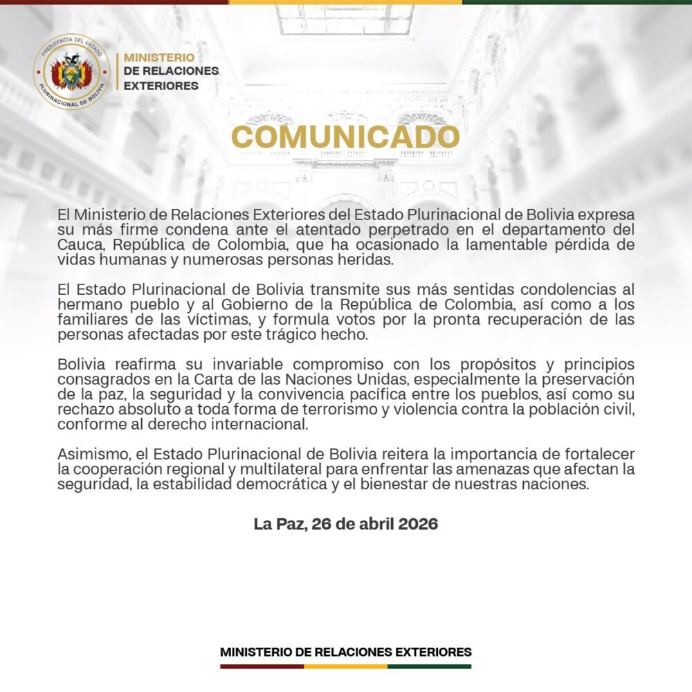 A través de la Cancillería, Bolivia expresó este domingo sus condolencias al pueblo de Colombia por el atentado que dejó pérdidas de vidas humanas en el departamento de Cauca y manifestó su rechazo a toda forma de terrorismo y violencia.