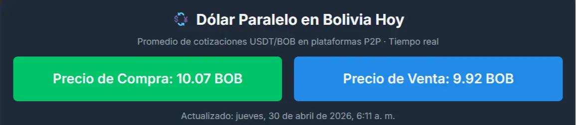 El dólar en el mercado paralelo boliviano registró este jueves 30 de abril una leve variación en su cotización, de acuerdo con datos publicados por plataformas digitales que siguen el comportamiento de la divisa fuera del sistema financiero oficial.