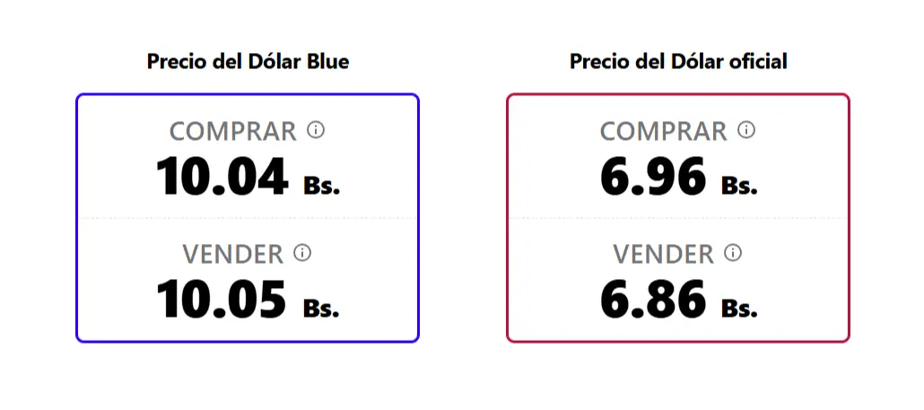 Por su parte, el sitio bolivianblue.net, que actualiza sus datos cada 15 minutos, reporta que la divisa se ubica en Bs 10,04 para la compra y Bs 10,05 para la venta. En su registro del cierre del miércoles, el portal señalaba Bs 10,28 para la compra y Bs 10,26 para la venta, lo que muestra un ascenso significativo en la cotización de compra y venta.