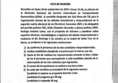 TSE: Presencia de Lara y Velasco en el debate fue confirmada con acta firmada por PDC y Libre 02-10-2025 21:20 Política Medios uruguayos señalan que Marset opera desde Bolivia con protección del PCC y mafias locales 02-10-2025 21:18 Seguridad Caso Emapa: Exfuncionario tiene más de Bs 3 millones, vehículos y propiedades, señala la Fiscalía 02-10-2025 21:16 Seguridad Monedas acuñadas en Bolivia son parte de un tesoro millonario de un naufragio español descubierto en EEUU 02-10-2025 21:13 Política Gasificación irrumpe una concentración del PDC en la zona sur de Cochabamba 02-10-2025 20:55 Política Inflación acumulada llega a 18,33%, lejos de la meta anual de 7,5% prevista para 2025 02-10-2025 20:32 Economía Pese a orden TSJ, revisión de detenciones preventivas solo llega al 1,03% de privados de libertad 02-10-2025 20:29 Seguridad Se inicia la temporada de lluvias, pero Bolivia aún enfrenta heladas, granizadas e incendios forestales 02-10-2025 20:27 Economía Más noticias
