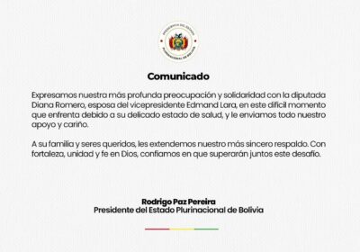 Paz y presidente de Diputados se solidarizan con Romero, esposa de Lara, y le transmiten fortaleza y esperanza 28-11-2025 16:48 PolíticaNP Fiscalía imputa a Rafael Arce Mosqueira: 133 actos investigativos hacen presumir su culpa 28-11-2025 16:44 SeguridadNP Ximena Galarza asume la dirección General de Comunicación Estratégica del Estado 28-11-2025 16:39 Política VideosNP ¿A qué juega Carlos Alarcón? Una incoherencia que favorece al MAS y atenta contra Rodrigo Paz 28-11-2025 16:32 OpiniónNadia Beller Santistevan advierte que redes de los ‘autoprorrogados’ siguen operando en La Paz y Beni 28-11-2025 16:10 Política Videos Agreden a panadera por vender pan a Bs 0,50 durante protesta de panificadores 28-11-2025 15:43 Sociedad Videos “Nos estamos envenenando”: Fuertes alerta que minería clandestina amenaza el agua de Potosí 28-11-2025 15:43 VidaNP Perú declarará estado de emergencia en sus fronteras para evitar ingreso descontrolado de migrantes desde Chile 28-11-2025 15:29 Política Más noticias