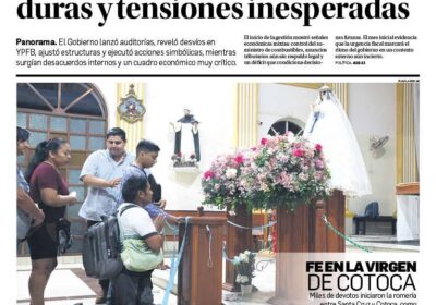 La Paz en busca de alcalde 08-12-2025 08:05 OpiniónJorge Roberto Márquez Meruvia Cochabamba: Gasifican a bloqueadores que desde hace 12 días impiden el ingreso al botadero en Colcapirhua 08-12-2025 08:02 Sociedad Videos Luego de tres días de bloqueo, el Consejo Nacional Electoral de Honduras anunció el reinicio del escrutinio de las elecciones 08-12-2025 08:00 Política Zelensky se reúne con los aliados europeos en Londres luego de que Trump lo cuestionara por demorar la respuesta a su plan de paz 08-12-2025 07:58 Mundo La ONU alerta de la «apatía» mundial ante ayuda humanitaria 08-12-2025 07:52 Mundo Portadas de los periódicos de Bolivia del lunes 8 de diciembre del 2025 08-12-2025 07:48 Monitoreobolivia,Bono,JuancitoPinto Horóscopo del lunes 8 de diciembre: Predicciones de Josie Diez Canseco para tu signo 08-12-2025 07:38 SocialesHoróscopo Un mes de poder: luces, sombras y giros del Gobierno de Rodrigo Paz 08-12-2025 07:31 Política Más noticias