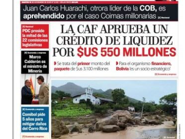 Portadas de los periódicos de Bolivia del martes 18 de noviembre del 2025 18-11-2025 09:01 Monitoreo Comando Vermelho de Brasil trafica con cocaína boliviana 18-11-2025 08:56 OpiniónManuel Morales Álvarez Inundación en Samaipata: Cuatro familias se refugian en el albergue de Achira 18-11-2025 08:36 Seguridad Videos El Estado cloaca y las tuberías pura aka 18-11-2025 08:11 OpiniónHenry Gonzalo Rico García “La gente gritaba y los cables reventaron”: Afectado en Achira relata el terror vivido tras el desborde del río 18-11-2025 07:45 Seguridad Videos TSE retiene credencial de diputado de AP por presunto certificado de idiomas falso 18-11-2025 07:32 Política Ministro Justiniano: Emapa operaba como un “pulpo de corrupción” y se prepara imputación a funcionarios 18-11-2025 07:30 Política Videos ¿Hasta cuándo se pronostican las lluvias y el descenso de temperatura en Santa Cruz? 18-11-2025 07:25 Vida Más noticias